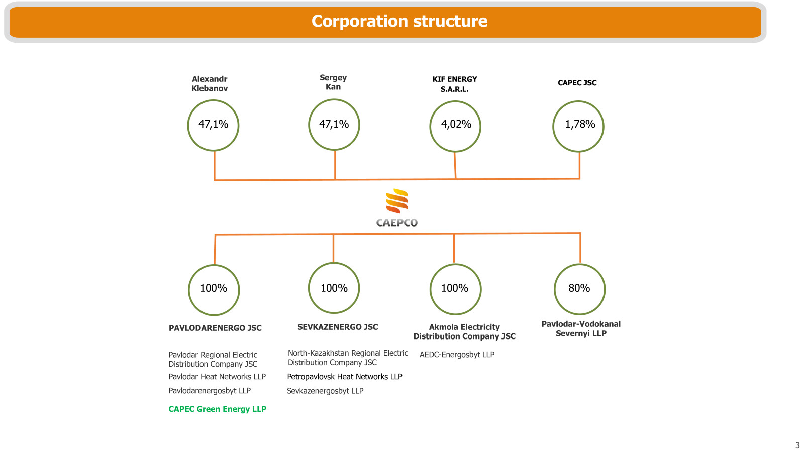 The group of companies CAEPCO JSC consists of SEVKAZENERGO JSC, PAVLODARENERGO JSC and Akmola Electricity Distribution Company JSC (AEDC JSC).